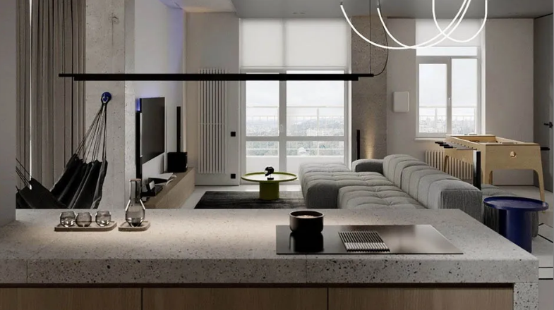 The L-shaped kitchen is a common layout for small apartments, making full use of corner space. The worktop, sink, and stove are arranged in an L-shape, creating a compact and efficient flow. This design aligns with small kitchen design ideas, making cooking more convenient while maintaining a sense of spaciousness, ideal for the daily needs of modern families.