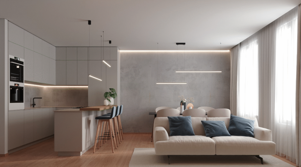 An open layout can make a small kitchen appear more airy and create an interactive space with the dining or living room. This open design allows the cooking area and living room to blend seamlessly, improving space utilization. This approach is a classic small kitchen design layout idea, ideal for small apartments, making the kitchen both functional and comfortable.